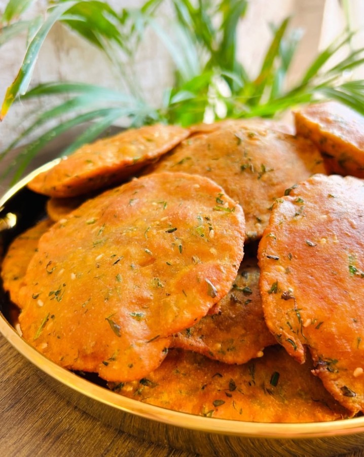 इस पिसे हुए पेस्ट को एक परात में डालें और उसमें लाल मिर्च पाउडर, हल्दी पाउडर, धनिया पाउडर, सफेद नमक, तिल, अजवाइन, सूजी, बारीक कटा हुआ हरा धनिया, घी – इन सभी चीज़ों को इस पेस्ट में अच्छी तरह मिला लें। उसके बाद इसमें आटा डालें और उसी पेस्ट में आटे को अच्छी तरह मिलाएँ और उस आटे में थोड़ा सा तेल लगाकर 10 मिनट तक ढँक कर रख दें।
